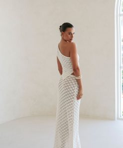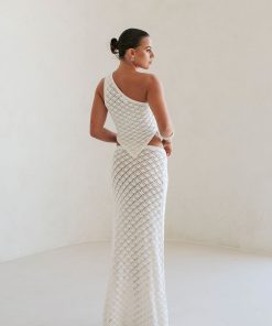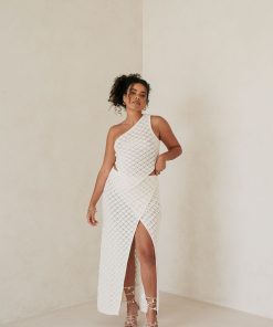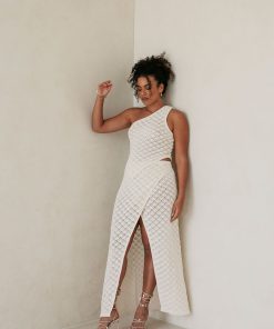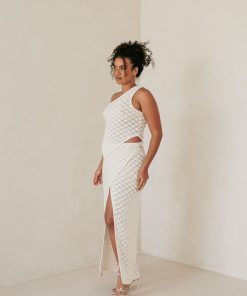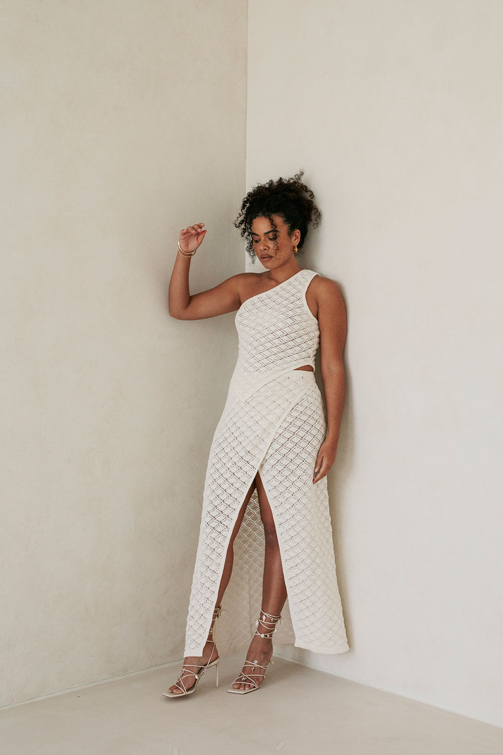 A design that flatters in fresh white! The Ria Skirt is made from a natural cotton pointelle knit and features a high waist, fixed wrap panel at front and split detail. Get the look and pair with the Ria Top! Designed exclusively by Sabo.