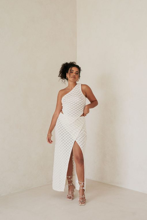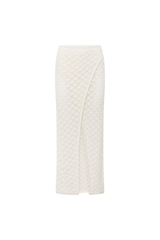 A design that flatters in fresh white! The Ria Skirt is made from a natural cotton pointelle knit and features a high waist, fixed wrap panel at front and split detail. Get the look and pair with the Ria Top! Designed exclusively by Sabo.
