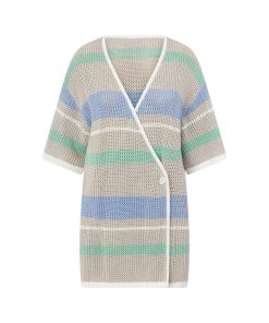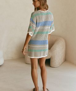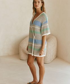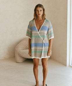 The perfect easy-to-wear trans seasonal piece, the Jessie Wrap Dress is made from a loose knit fabric in blue, green, grey and white hues. It is a super relaxed style featuring drop shoulders, short boxy sleeves, plunging neckline, wrap panel at front with button closure at side, contrast white trims and a mini hem. Style with the Kia Sandals! Designed exclusively by Sabo.