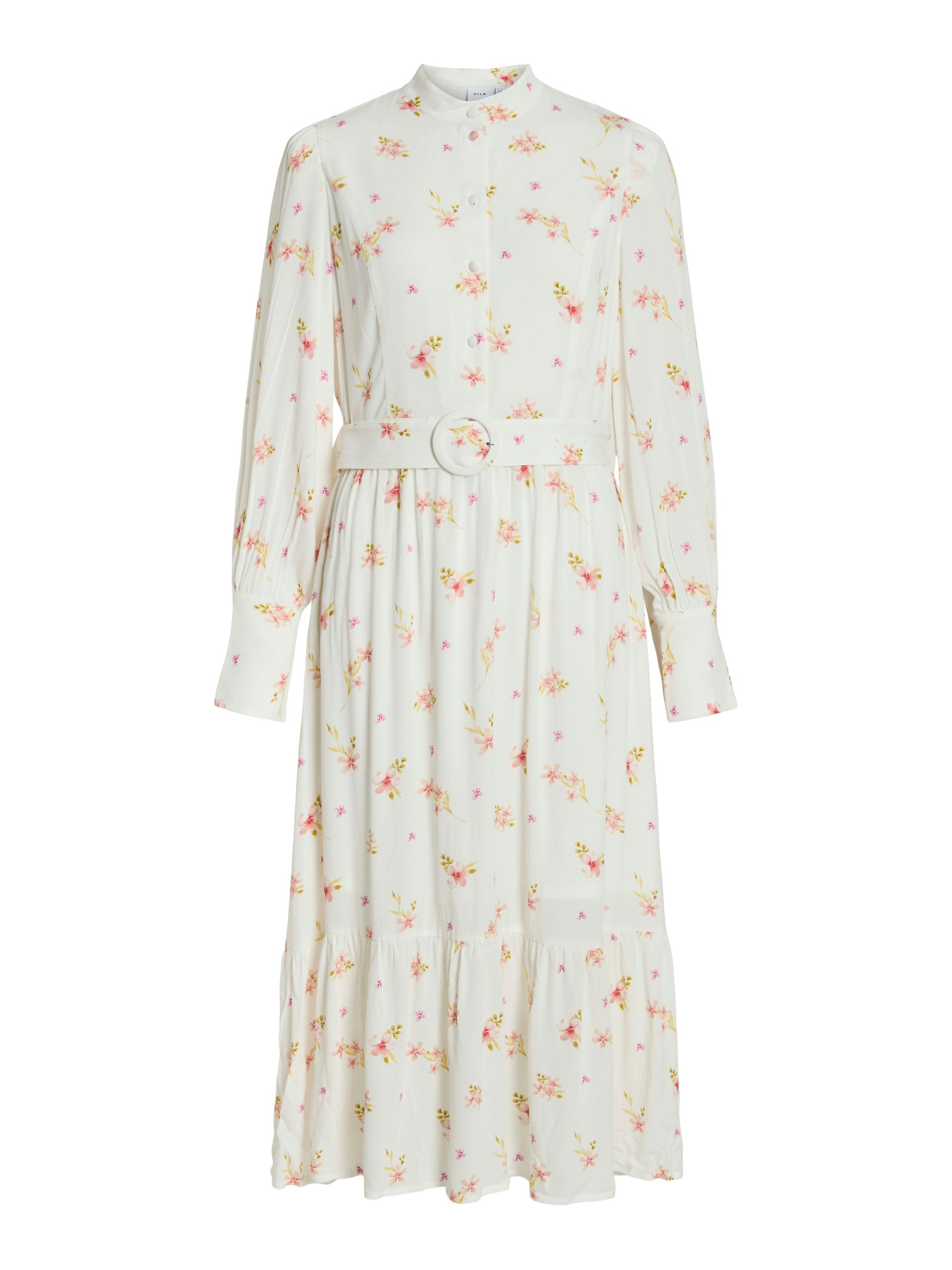 A long sleeve midi dress with button detail along exaggerated cuffs, a raised collar, five button front and matching fabric belt. The tiered skirt and main body are lined for comfort. The delicate floral print on an off white base epitomises summer.