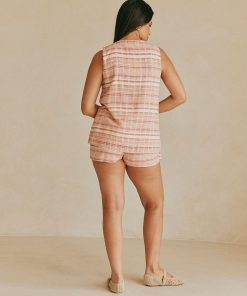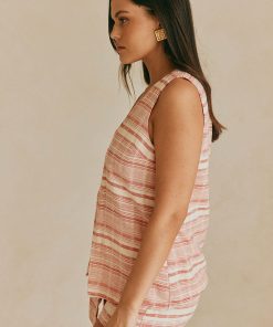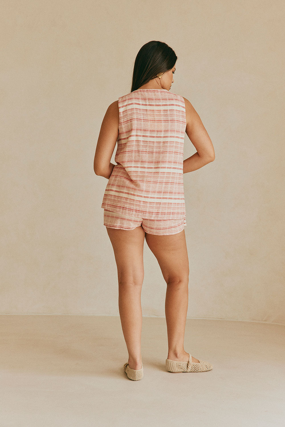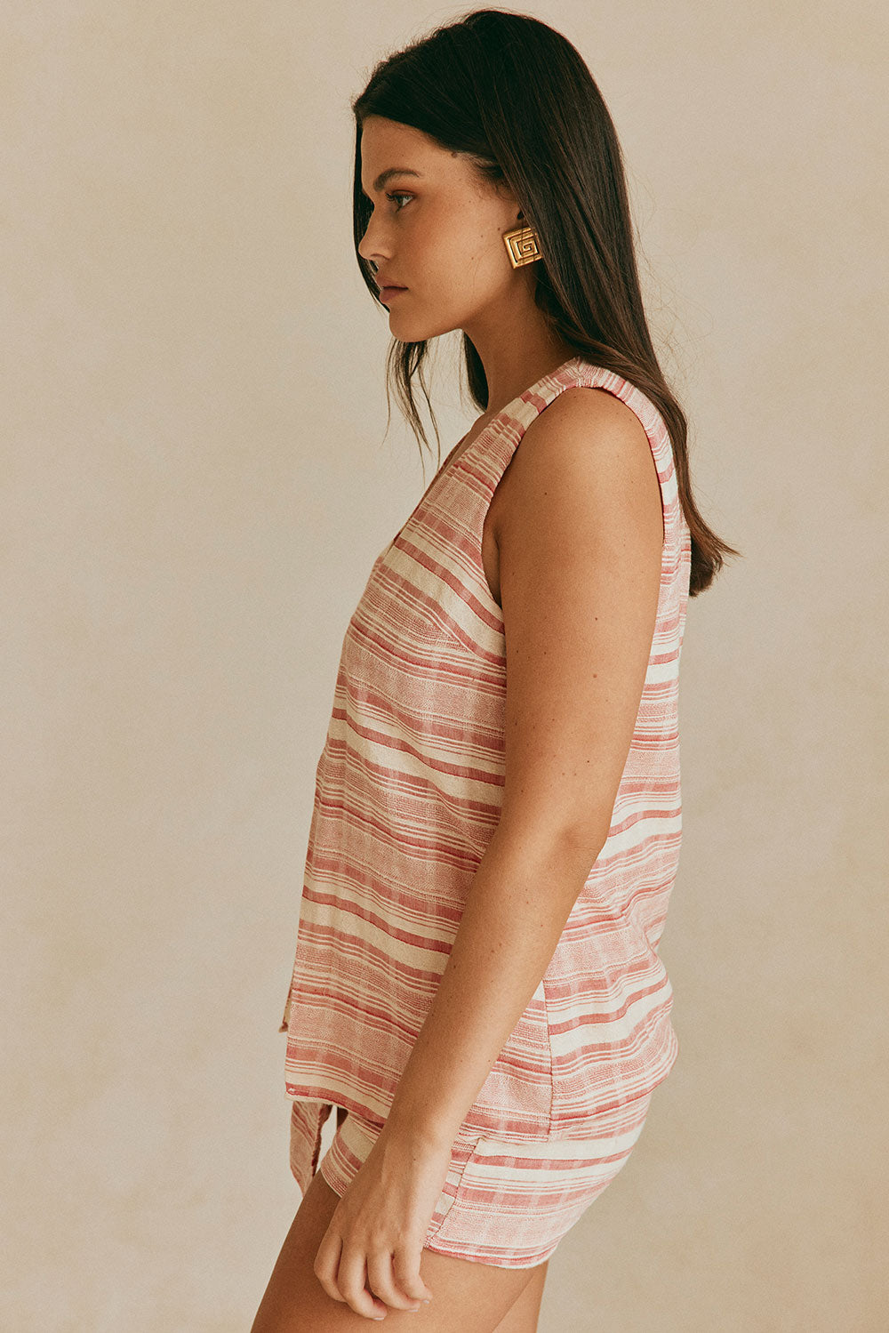 The ultra chic Nihira Top is made from a high quality natural cotton fabric with pink and white stripes. It is a longline style featuring a V neckline with hook-eye closure, split at centre front and tank sleeves. Get the look with the Nihira Skirt and style with the Dia Heels! Designed exclusively by Sabo.