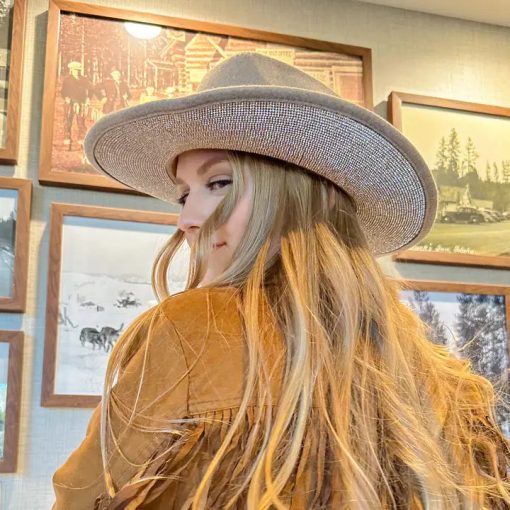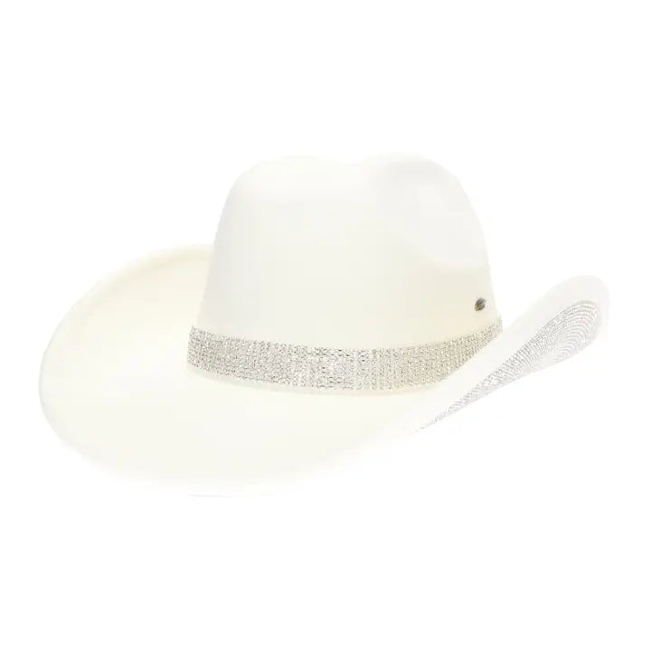A cowboy hat with a ALL the rhinestones a girl could ever want! This cowboy hat delivers the shine of your dreams with its rhinestone encrusted underbrim and band!