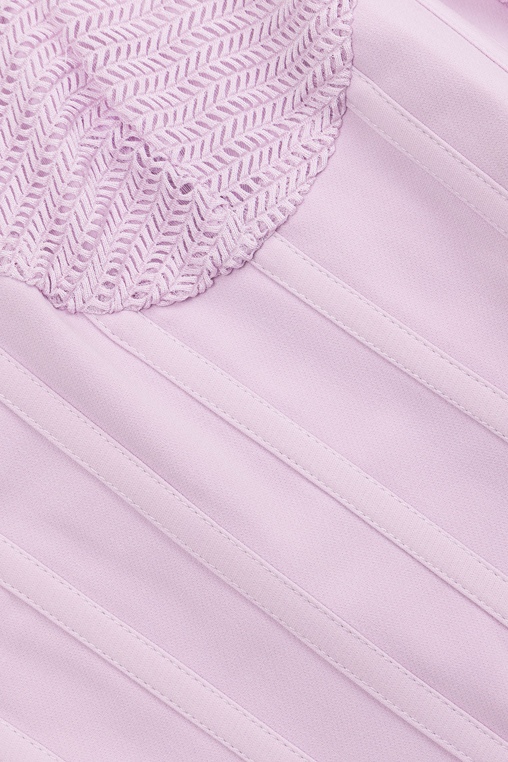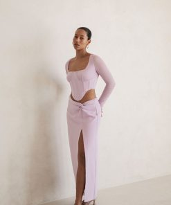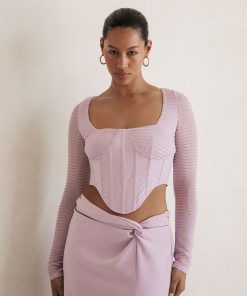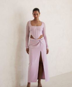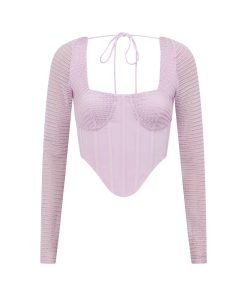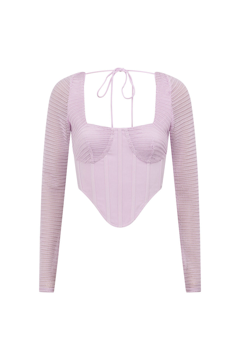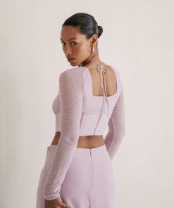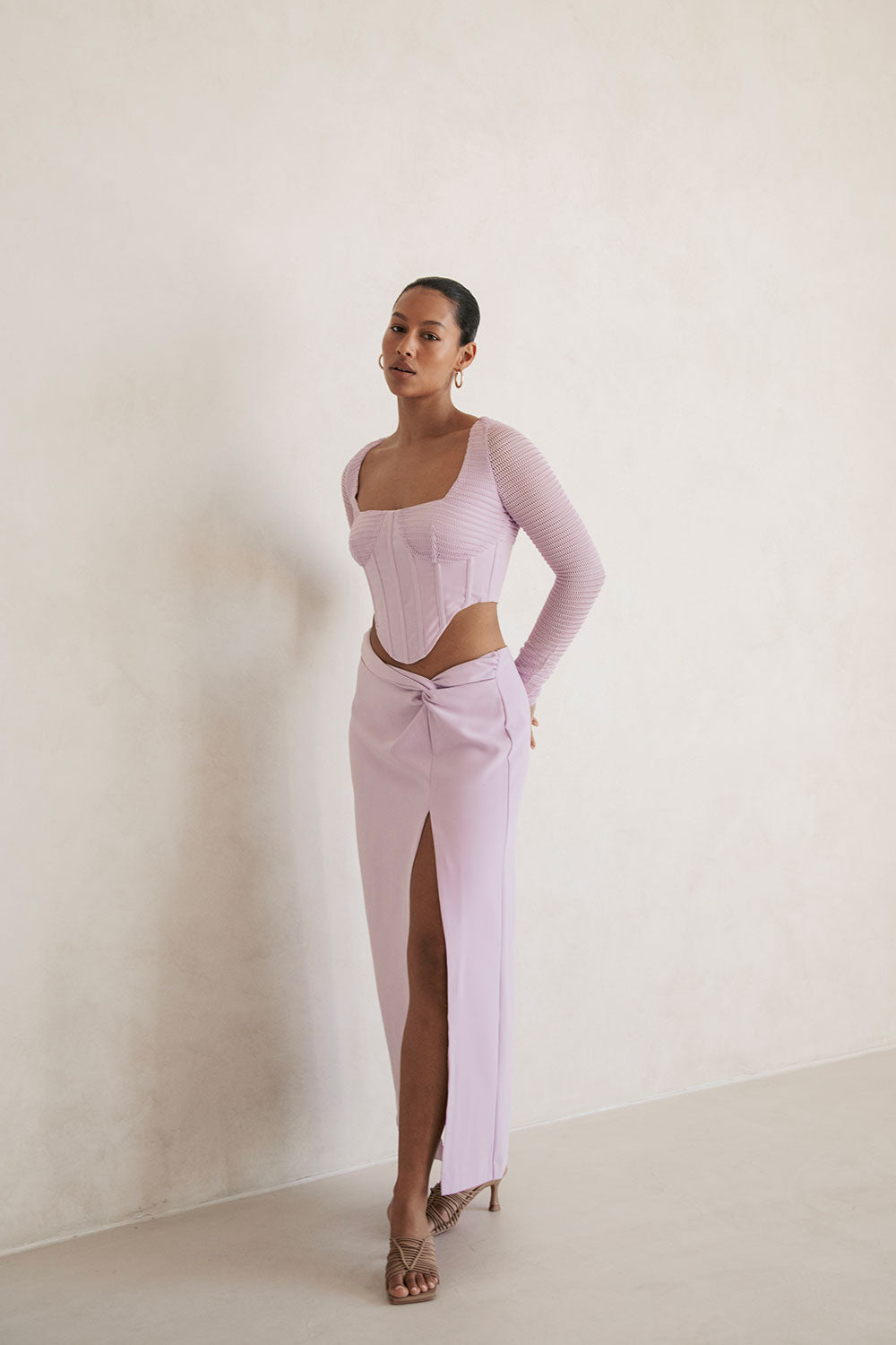 Dress it up and wear it as a set or pair it back with jeans, the Vedrana Top is made from a stunning contrast of mesh and suiting fabrics in a lavender hue. It features full length unlined mesh sleeves, lined mesh cups, square back neck with tie detail, boning in bodice and a curved hem. Get the look with the Vedrana Midi Skirt and Lena Mules! Designed exclusively by Sabo.