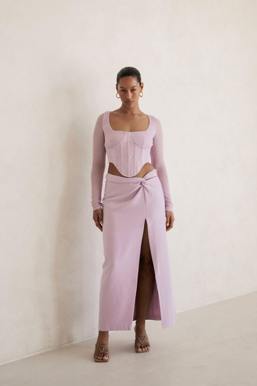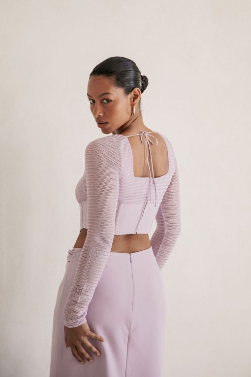 Dress it up and wear it as a set or pair it back with jeans, the Vedrana Top is made from a stunning contrast of mesh and suiting fabrics in a lavender hue. It features full length unlined mesh sleeves, lined mesh cups, square back neck with tie detail, boning in bodice and a curved hem. Get the look with the Vedrana Midi Skirt and Lena Mules! Designed exclusively by Sabo.