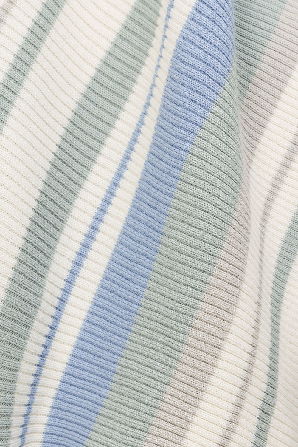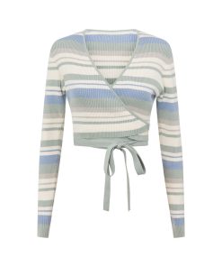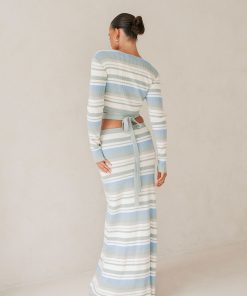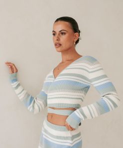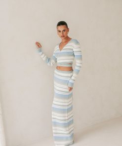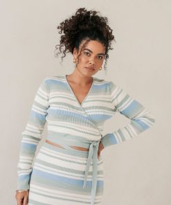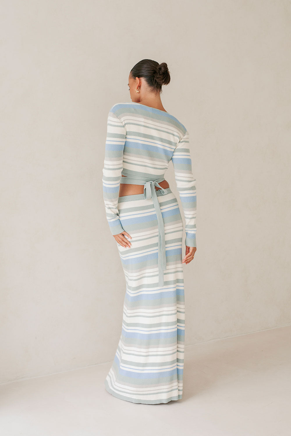 The perfect set as the weather cools down, the Kaila Top is made from a natural cotton knit fabric with blue, dusty sage and white stripes. It is a wrap style featuring full length sleeves. Get the set with the Kaila Skirt and pair with boots! Designed exclusively by Sabo.