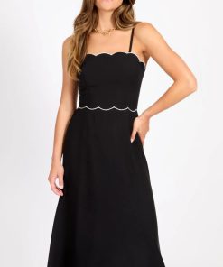 Brook is a midi dress with scalloped shaped details defined by contrast white stitching and further enhanced by a cut out panel at the back. The linen style fabric makes it perfect for wearing to a day time occasion while still holding its own when night time comes.