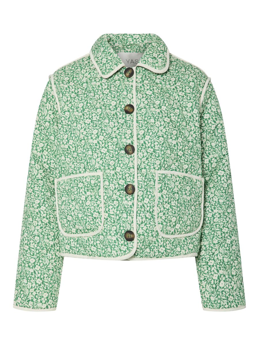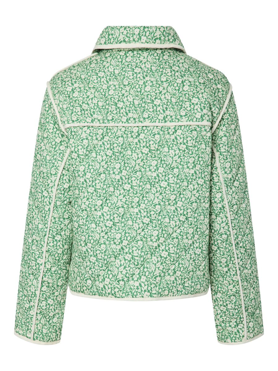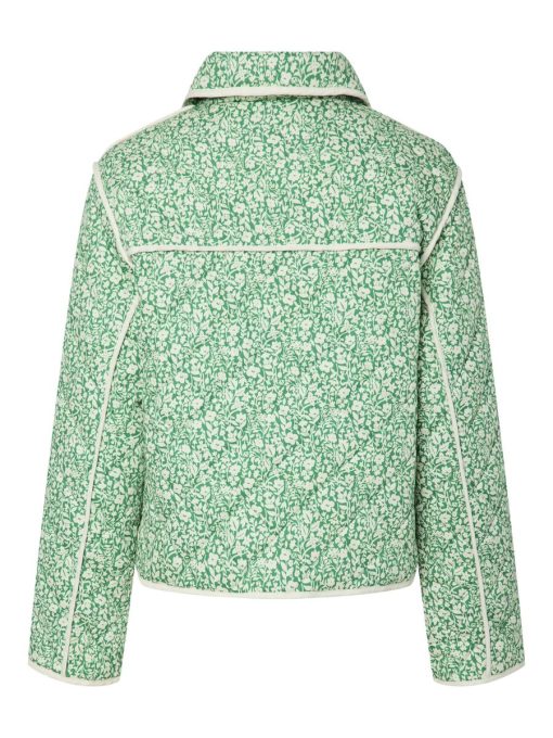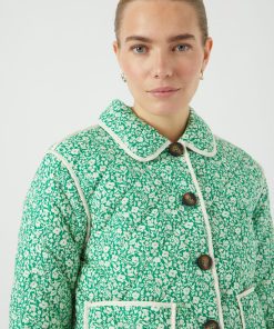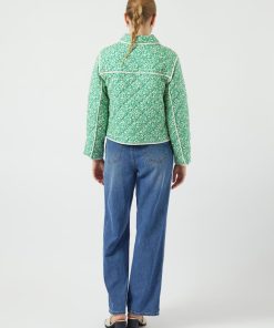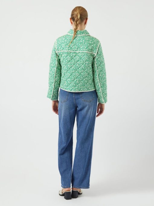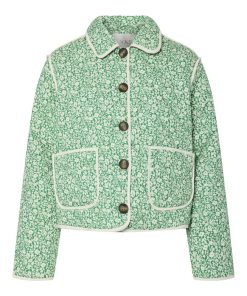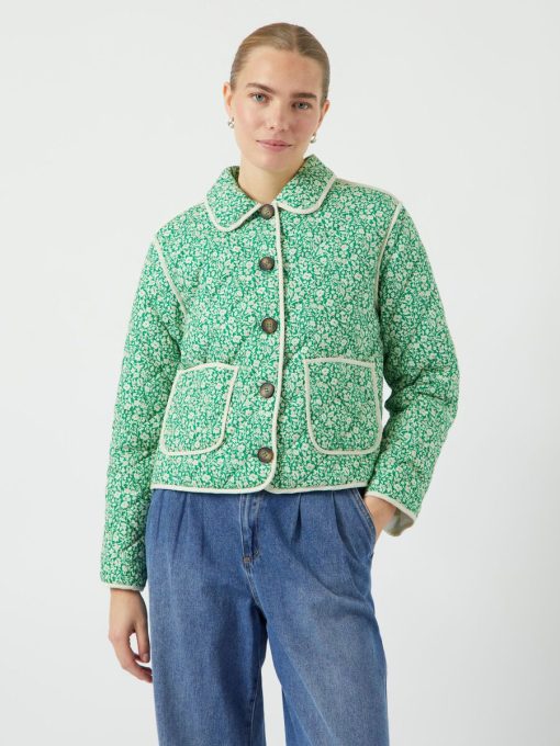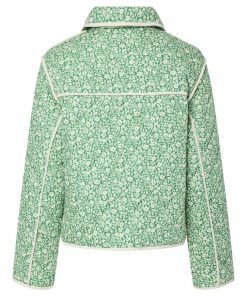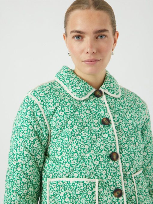 The Rinna is a quilted jacket with a lapel collar, button down front, two front pockets and dropped shoulders. The contrasting edging compliments the bright green and cream floral pattern.