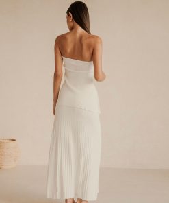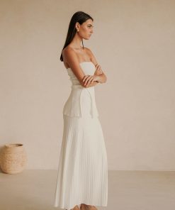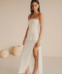 Dress it up with heels for the perfect date night look! The Saria Skirt is made from a textured mini pleated fabric in white and features a high elasticated waist, ankle grazing maxi skirt and super high split detail. Get the set with the Saria Top! Designed exclusively by Sabo.