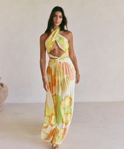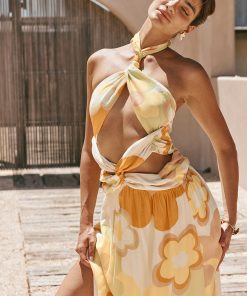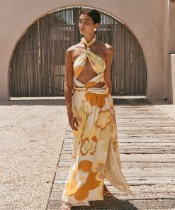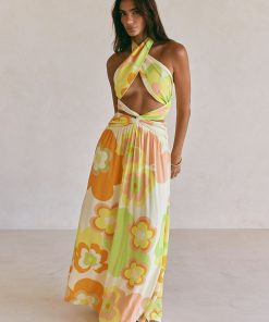A fun design with our exclusive bold Retro Bloom print! The Jorah Maxi Dress is made from a viscose crepe fabric and features a halter neck tie, cutouts at bodice, twist drape details at waist and a flouncy maxi skirt. Dress it up with heels for your next night out! Designed exclusively by Sabo.