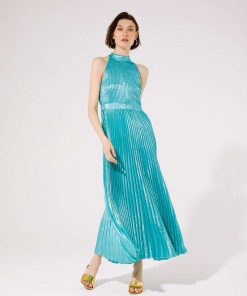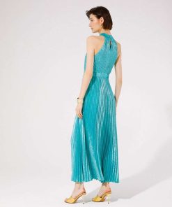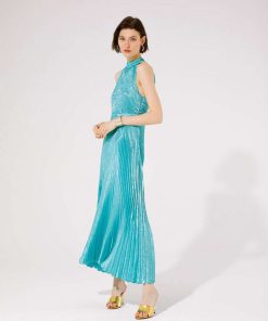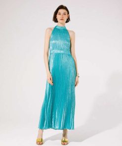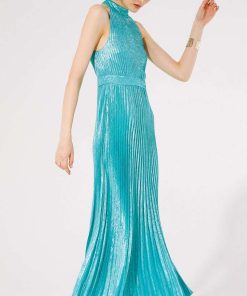 A maxi length, halter neck dress the Kalisis features a pleated design with a shimmer effect fabric. The banded waist accentuates the silhouette and the halter cut makes it perfect for formal events.