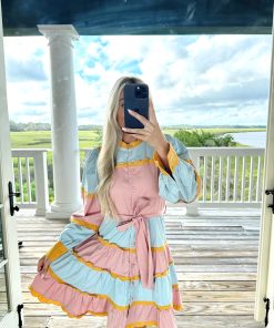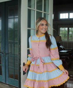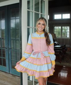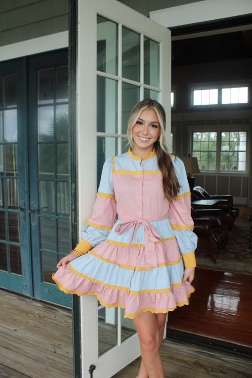 Say hello to our Bridgerton Button Down Mini Dress. Crafted in mustard scallop detailing with a muted pink and blue mix. This dress is so feminine and fun!