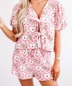 Our Galentine PJ set is the perfect set for a girls night in! This set features puff sleeves, heart designs, bow tie detailing and pockets.
