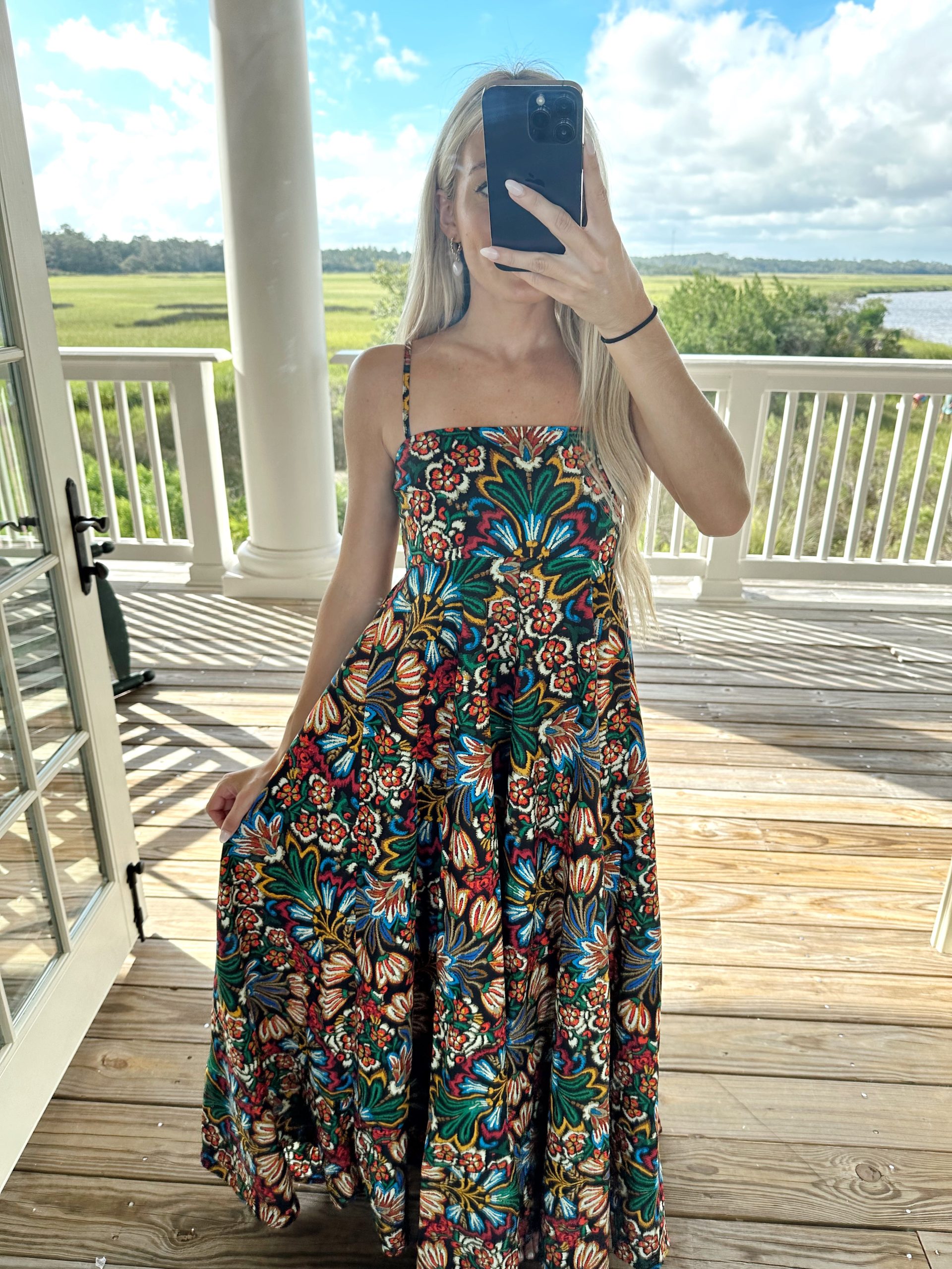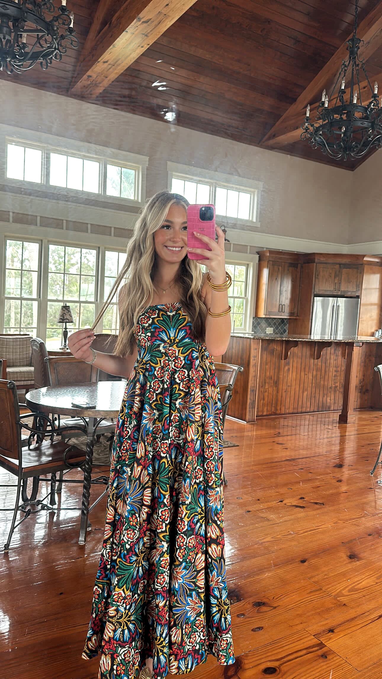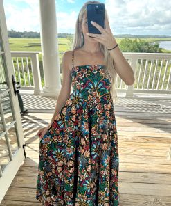 Our Nola Midi Dress features a beautiful floral pattern with spaghetti strap sleeves. This dress is the perfect fall transition dress. You can also throw it on with a stylish fall jacket on colder days!