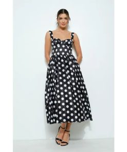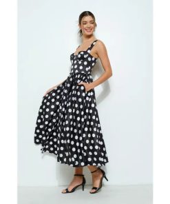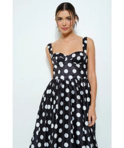Get ready to turn heads in our Polka Dot Bustier Midi dress! The flattering sweetheart neckline and midi length make this dress a perfect choice for any occasion. The playful polka dot pattern adds a touch of fun to this otherwise classic style. Stand out in style and make a statement with this unique piece. (Playfully chic!)