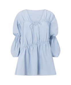 From our new Daybreak collection, the Ava Dress is made from a structured cotton fabric in blue, it features a V neckline with draw rouleau tie, puff sleeves, asymmetric elasticated panel details throughout and a mini length hem. Style with the Vivian Sandals! Designed exclusively by Sabo.