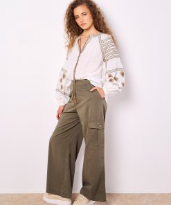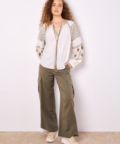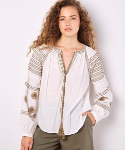 Embrace the boho trend with this Aztec-embroidered blouse. Lightweight and woven, it features a figure-skimming fit to create a soft silhouette, balloon sleeves, and a V-neck with tie. Style with wide-leg trousers for a casual weekend-ready finish.