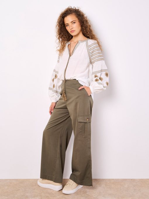 Embrace the boho trend with this Aztec-embroidered blouse. Lightweight and woven, it features a figure-skimming fit to create a soft silhouette, balloon sleeves, and a V-neck with tie. Style with wide-leg trousers for a casual weekend-ready finish.