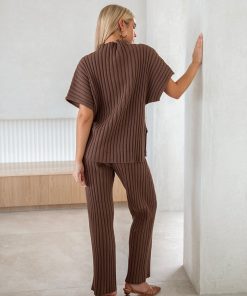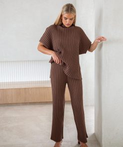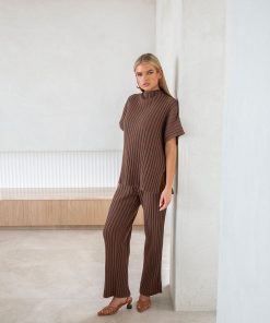 A chic trans seasonal set! The Celine Top is made from a ribbed knit cotton fabric in a chocolate hue. It is a relaxed style featuring a polo neckline, short sleeves and splits at sides of hems. Style your look with the Celina Pants and slides! Designed exclusively by Sabo.