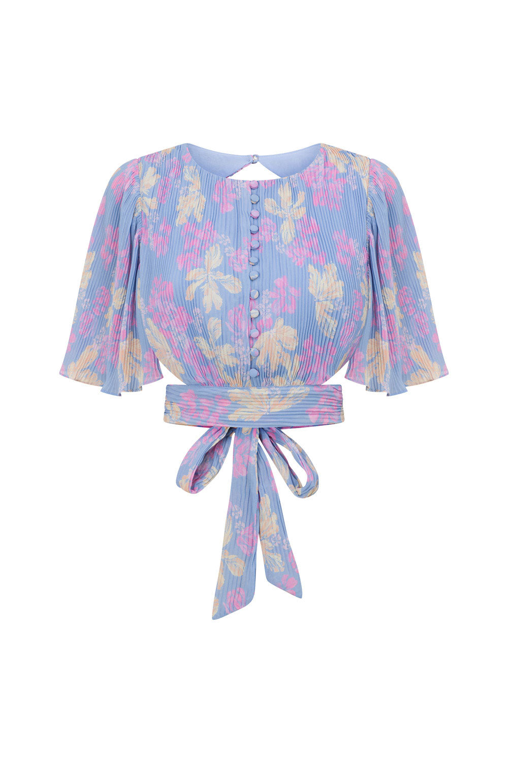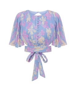 A vintage inspired set, the Sabo Luxe Domino Pleated Top is made from a luxurious pleat chiffon fabric with our exclusive iris vacay print. It features an open back, floaty short sleeves, covered buttons at centre front and waist cutouts with a tie at back. Pair with the Domino Pleated Skirt and gold heels! Designed exclusively by Sabo.