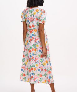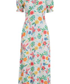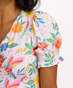 A classic tea dress, with a V-neck, empire line bust seam and shirred sleeve with frill. Featuring a tropical hummingbird print of colourful flowers and hummingbirds on an off-white base.