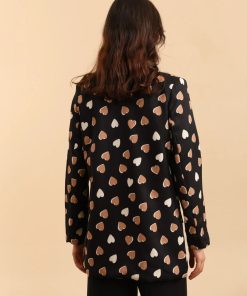 A straight cut blazer with an all over brown and cream hearts print on a black base. Featuring a single breasted style with front lapel pockets and fully lined for your comfort. Perfect for adding some fun to your outfit.
