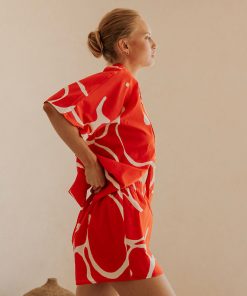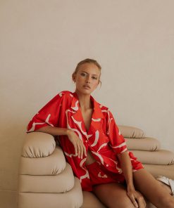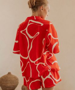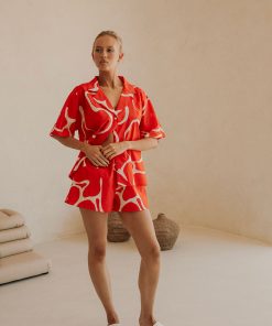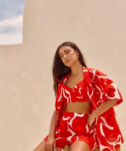 The relaxed resort style Seona Top is made from a high quality natural cotton fabric with our exclusive Evoke Red print. It is a relaxed style featuring a collar and low lapel, boxy sleeves and white buttons down centre front. Get the look with the Seona Shorts and style with sandals! Designed exclusively by Sabo.
