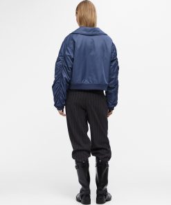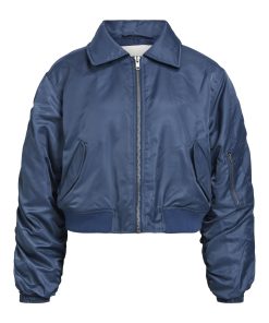 The ULA Bomber Jacket features a classic bomber style with a central zipper and two front pockets, as well as a zipped arm pocket. The gathered detail along the sleeves, elasticated cuffs and ribbed hem elevate this must have jacket.