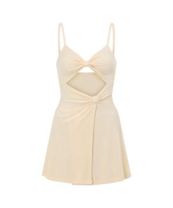 The perfect party dress! The Ale Dress is made from a ribbed fabric in a cream hue. It features thin adjustable bind straps, gathered pinch details at centre bust and side waist, cutout at waist and an a-line mini skirt with wrap detail. Keep it casual with the Kia Sandals or dress it up with Zita Strappy Sandals! Designed exclusively by Sabo.