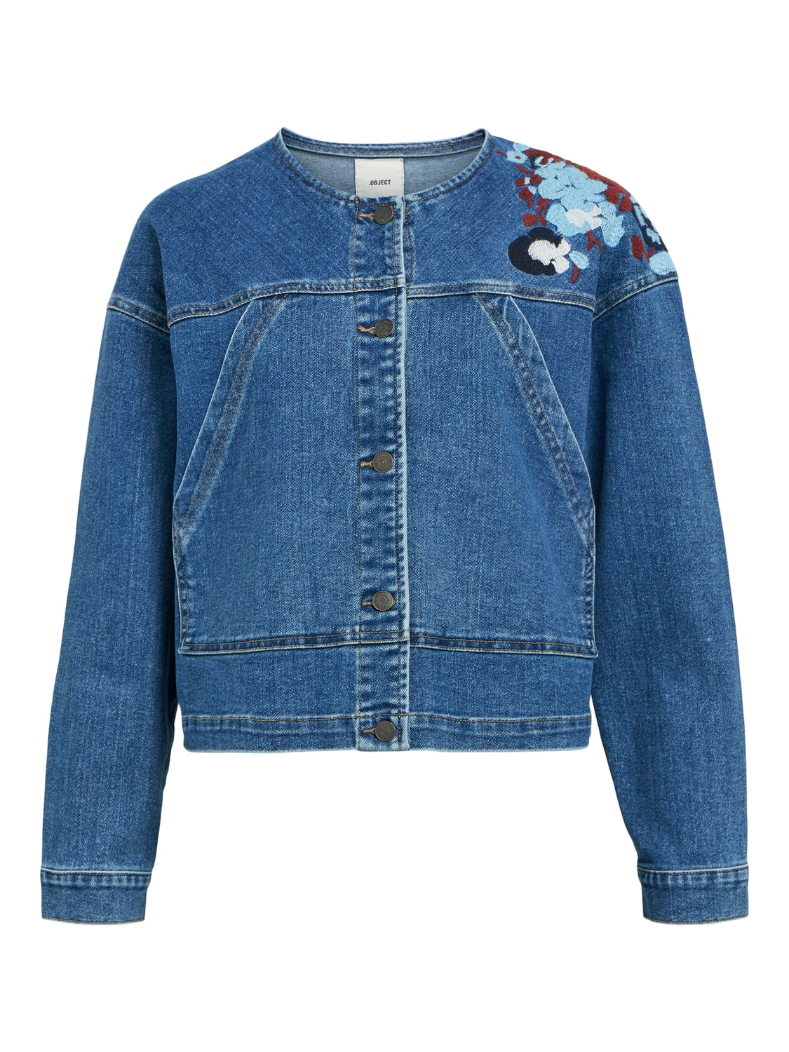 Introducing the Zenia Denim Jacket. With a collarless design, this button down jacket features large pockets and intricate embroidery on one shoulder. Stay stylish and stand out from the crowd with this playful twist on a classic.
