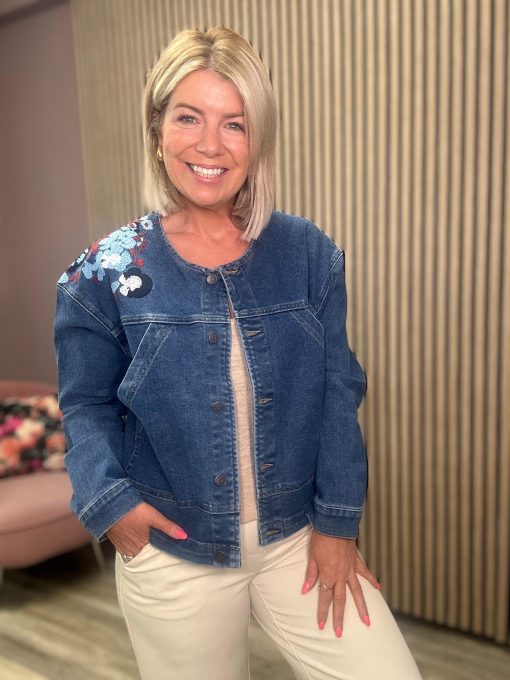 Introducing the Zenia Denim Jacket. With a collarless design, this button down jacket features large pockets and intricate embroidery on one shoulder. Stay stylish and stand out from the crowd with this playful twist on a classic.