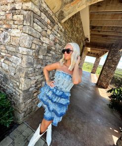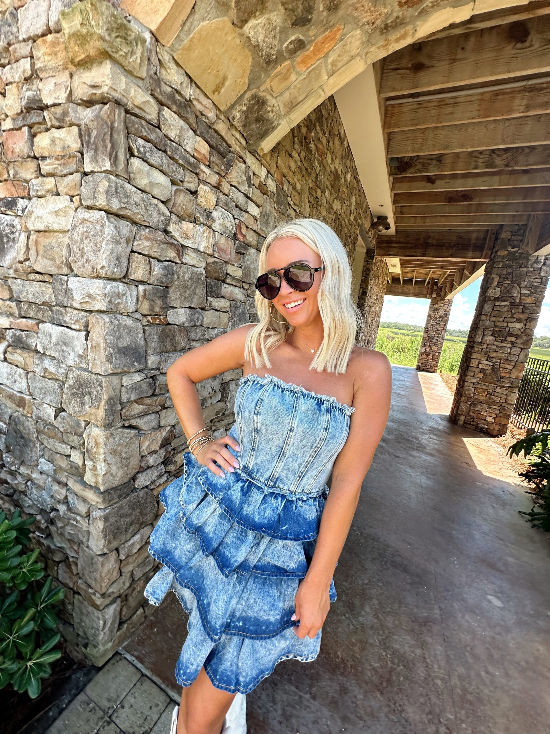 Our Larson Layered Mini Dress features a strapless neckline, layers of ruffles and a washed denim frill.