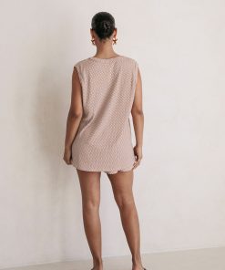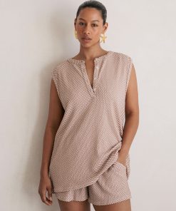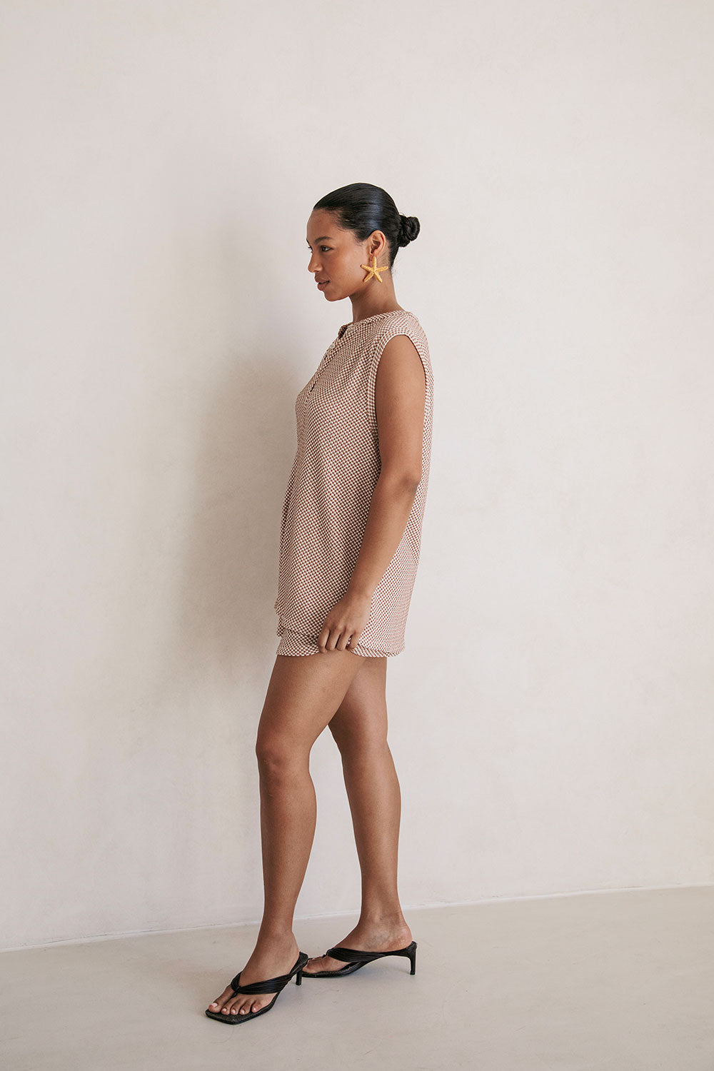 Keep it casual with slides or dress it up with heels! The Marah Top is a relaxed style made from a lightweight woven brown and white fabric featuring a high neckline, V neckline opening, button closure and longline hem. Get the set with the Marah Shorts! Designed exclusively by Sabo.