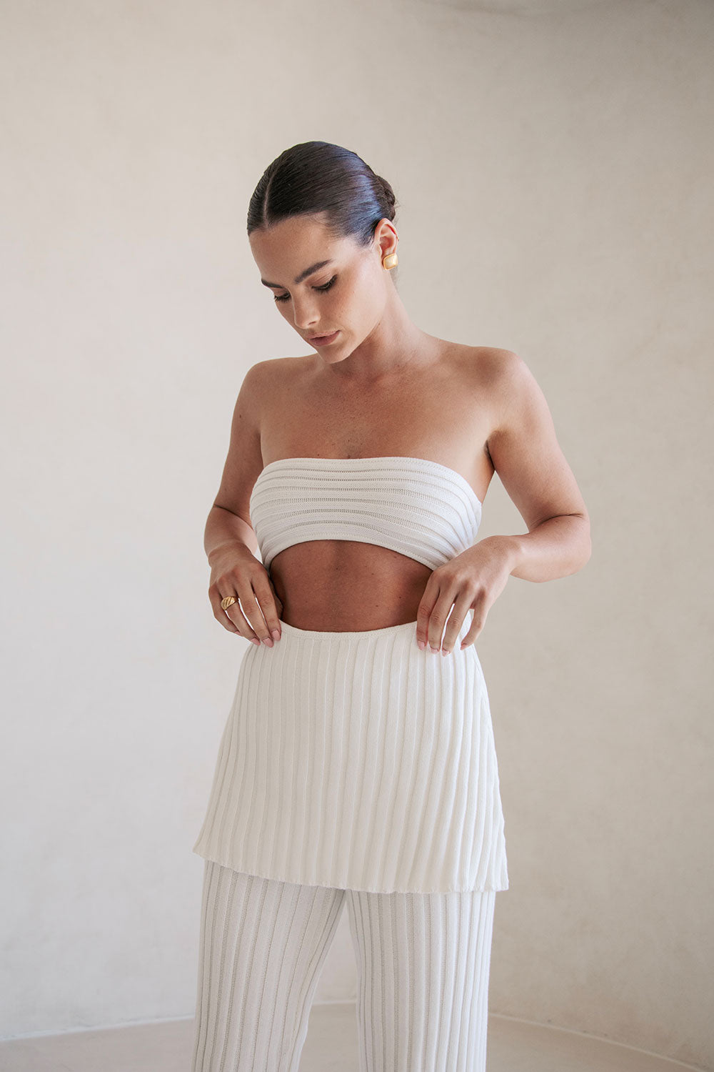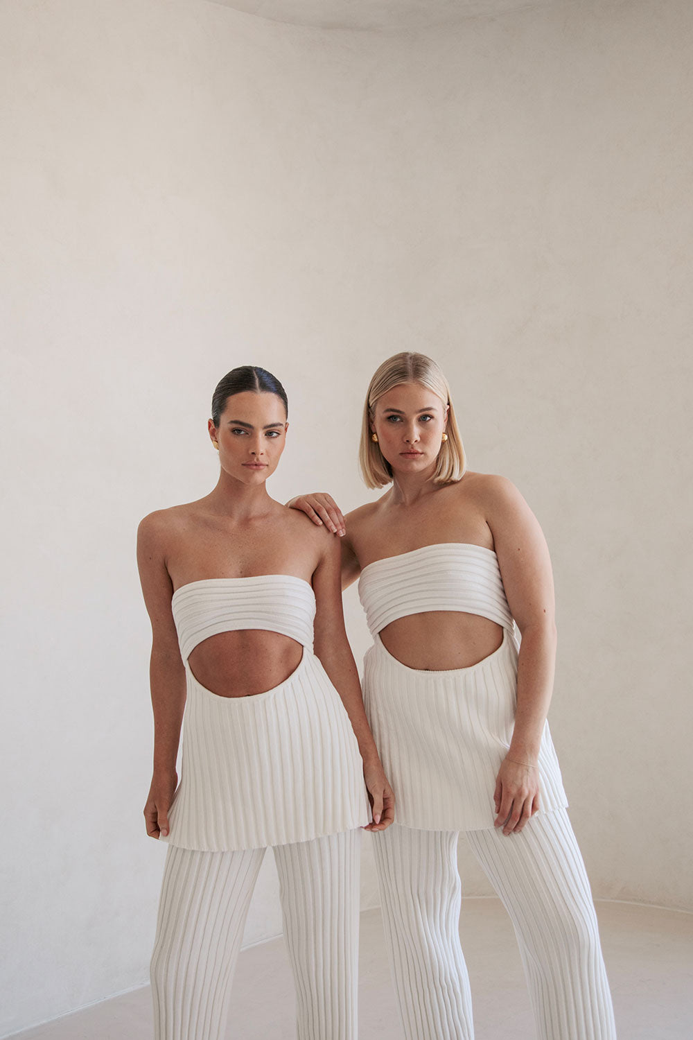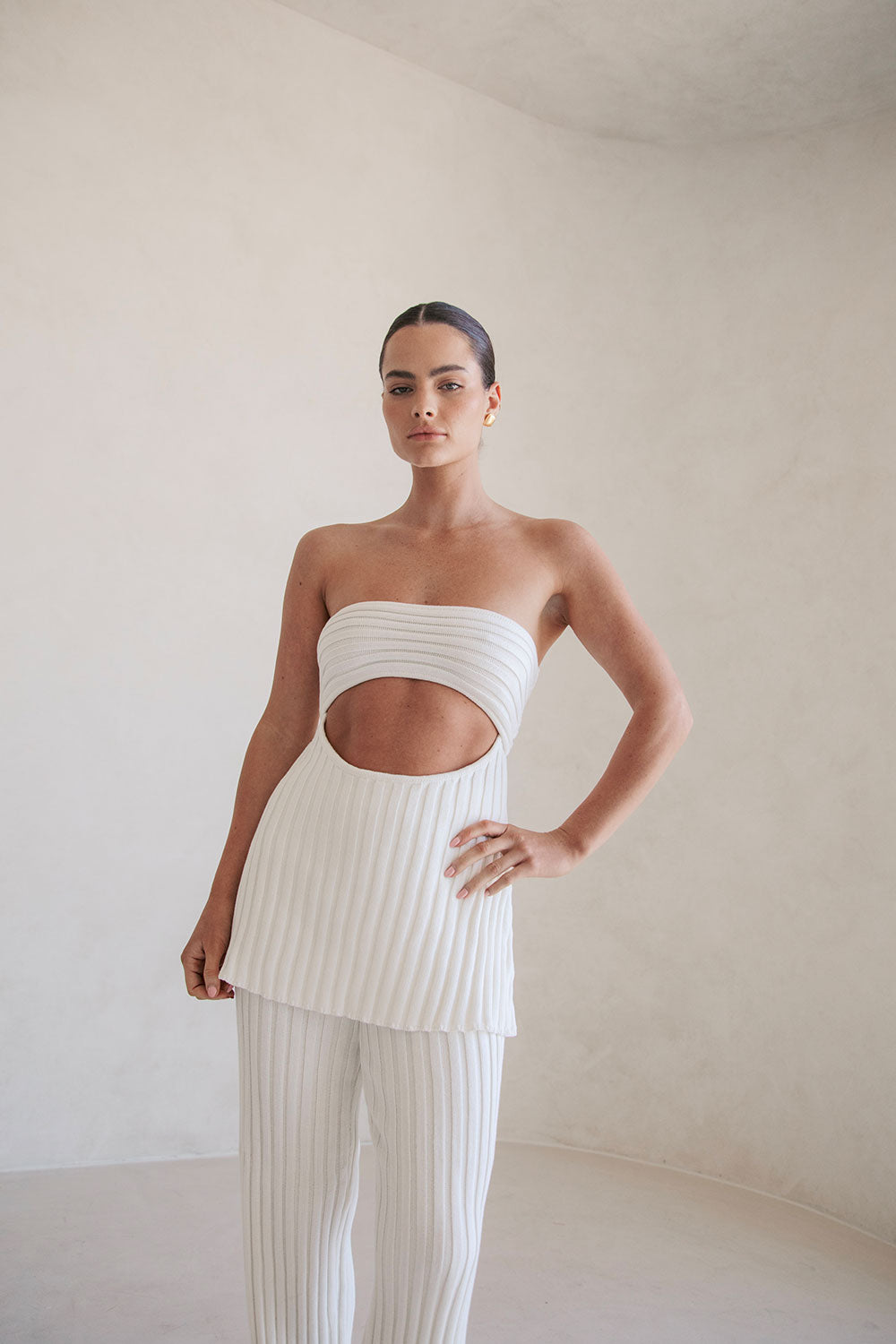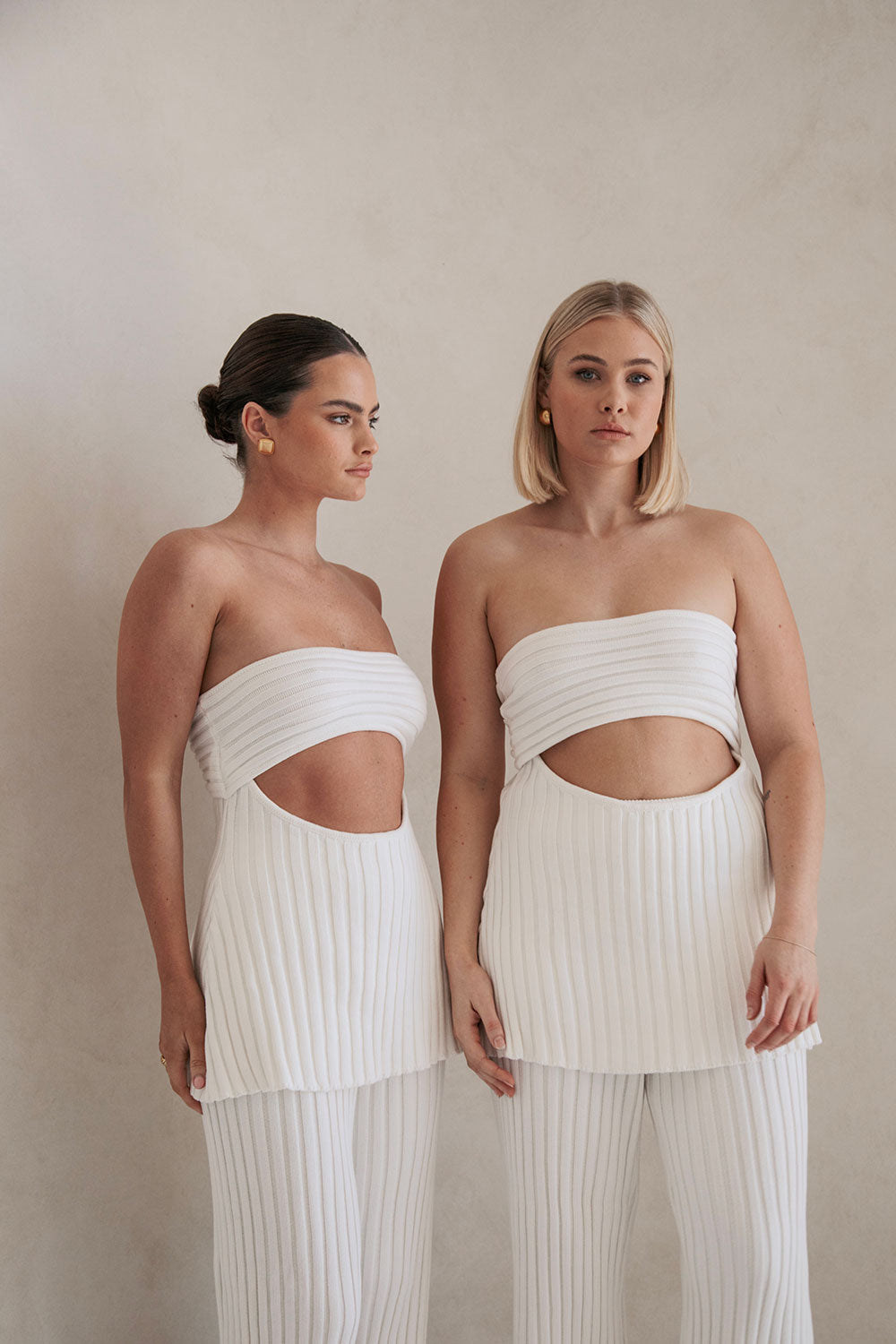 A structured lovers dream! The Stevie Top is made from a natural ribbed knit fabric in white. It features a strapless neckline, cutout at front waist and a longline hem. Get the set and pair with the Stevie Pants! Designed exclusively by Sabo.