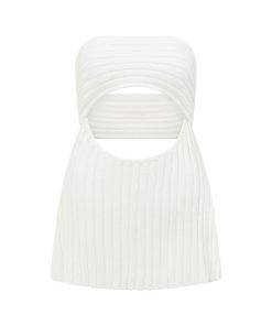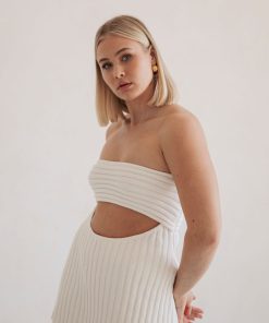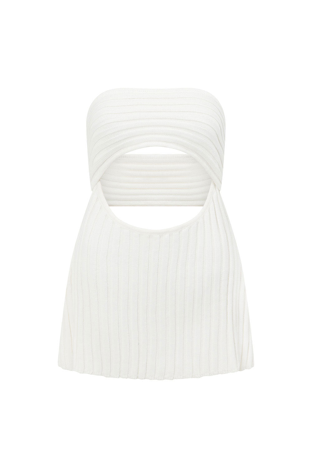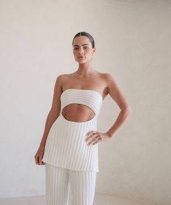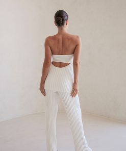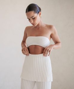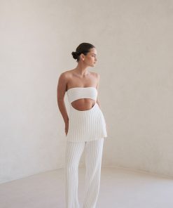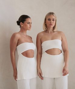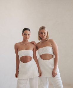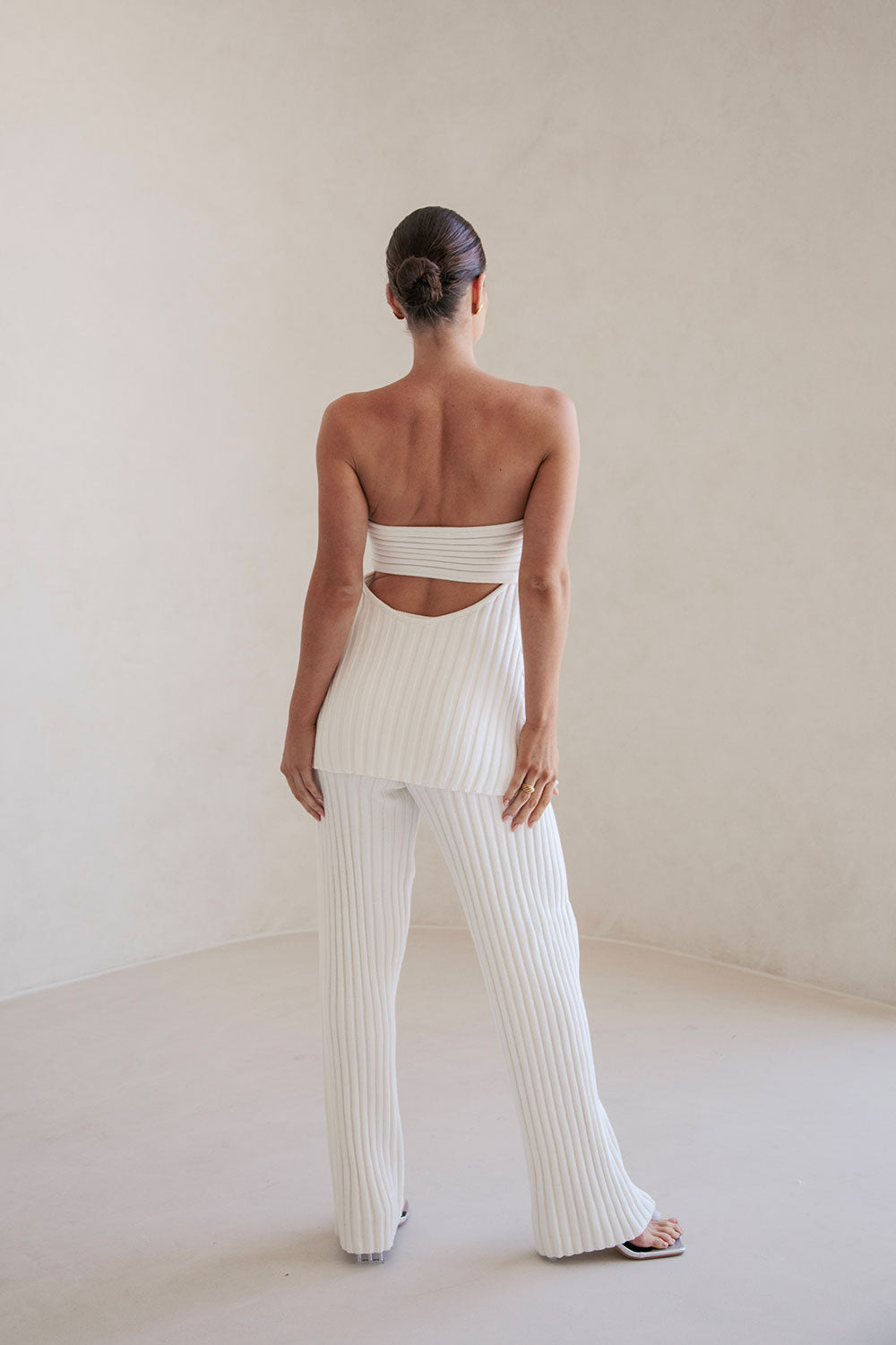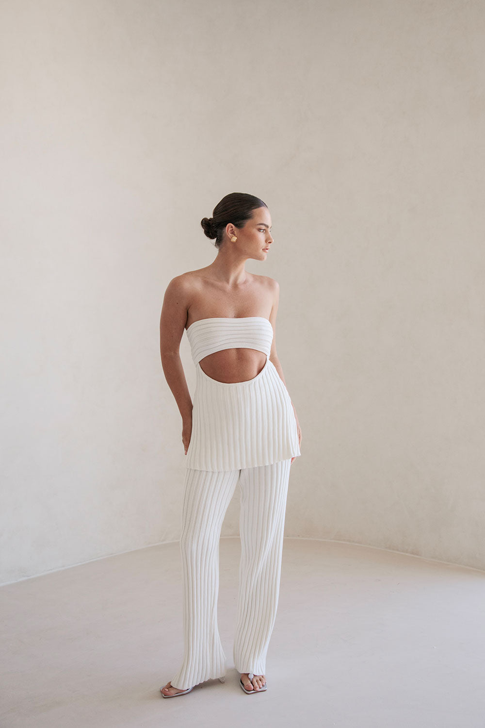 A structured lovers dream! The Stevie Top is made from a natural ribbed knit fabric in white. It features a strapless neckline, cutout at front waist and a longline hem. Get the set and pair with the Stevie Pants! Designed exclusively by Sabo.