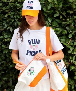 Serve up serious style with the “Club Pickle” Ball Cap, a must-have for pickleball enthusiasts! Featuring embroidered paddles and bold lettering, this cap is perfect for showcasing your love for the game on and off the court. Its white and vibrant orange color combo adds a playful pop to your sporty wardrobe, while the adjustable fit ensures comfort for all-day wear. Pair with other items from the Pickleball Collection to complete your look!