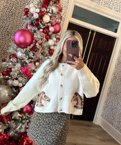 Our Equestrian Club Cardigan features an elegant horse graphic with ribbed trim detailing. This Knit Crew neck is styled perfectly over our Luna Leopard Mini Dress!
