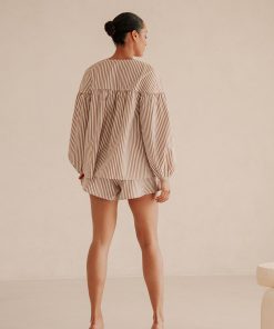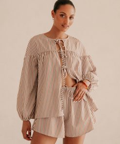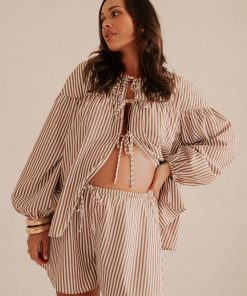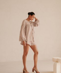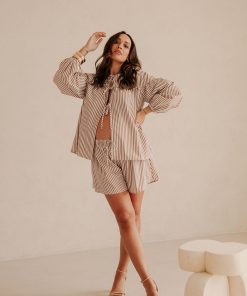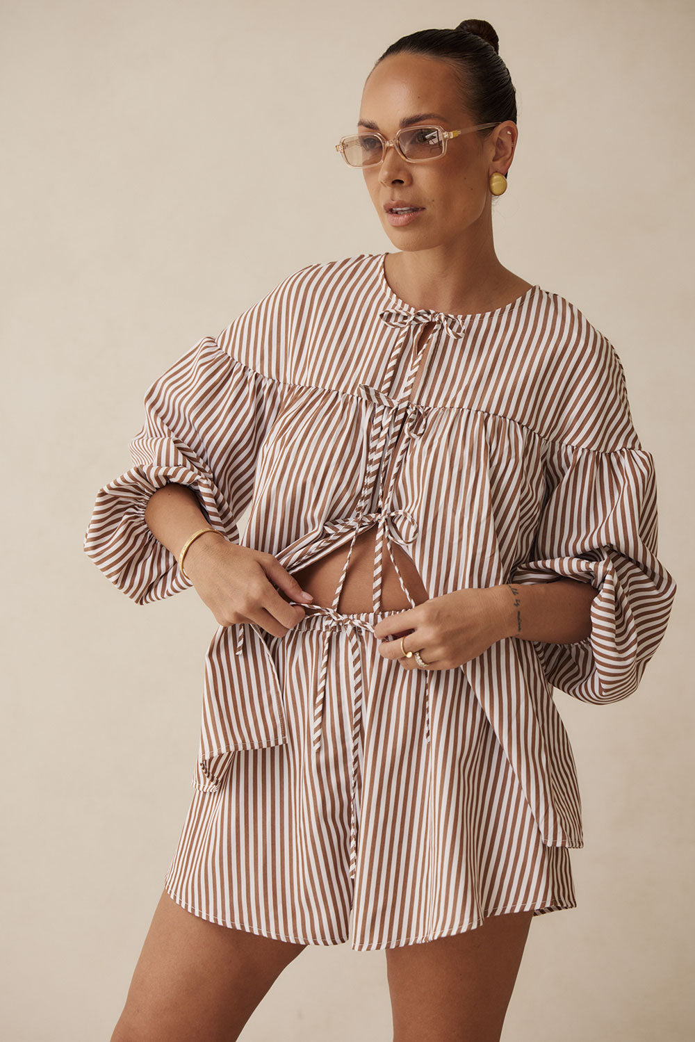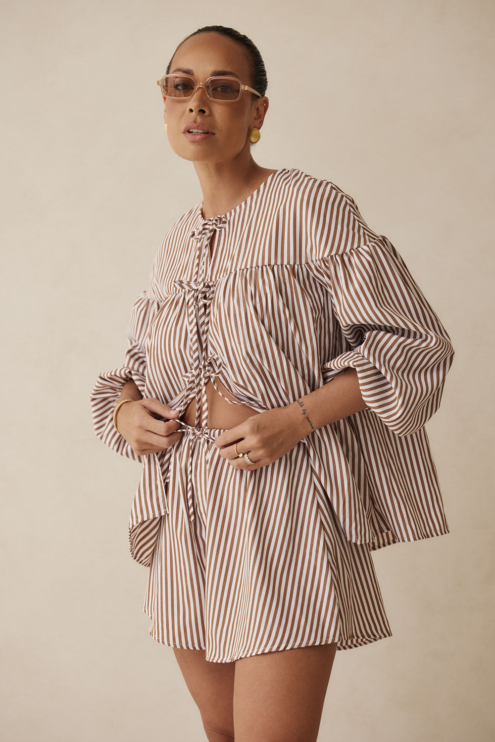 The perfect set for summer from our SABO x Kayla Boyd collection, the Pennie Shorts are made from a luxurious lightweight fabric in tan and white stripes. They are a high waisted style with a thin elasticated waist, drawstring and high-low hems. Pair with the Pennie Top. Designed exclusively by Sabo.