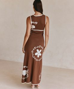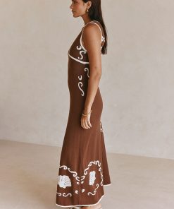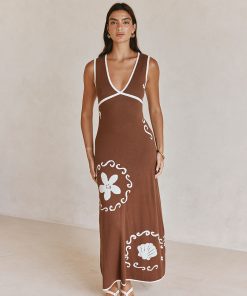 Pair it with heels for a stunning look for a long lunch, the Emelia Dress is made from a natural cotton knit with our exclusive Ocean Relic intarsia knitted throughout. It features a V neckline with fitted bust panels, contrast white trims and a flouncy maxi skirt. Style your look with the Dia Heels! Designed exclusively by Sabo.
