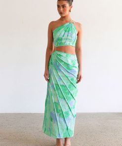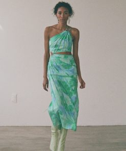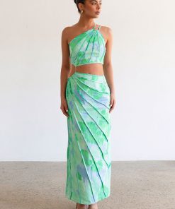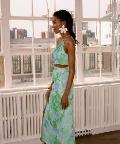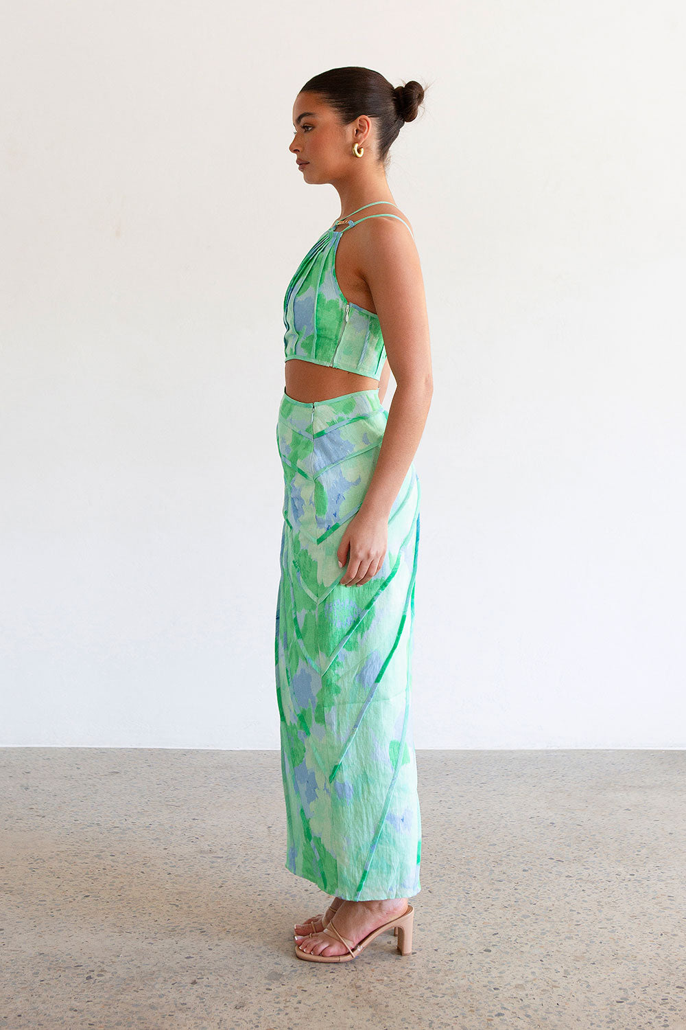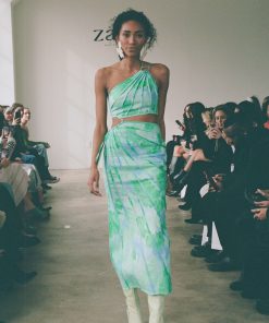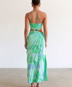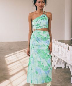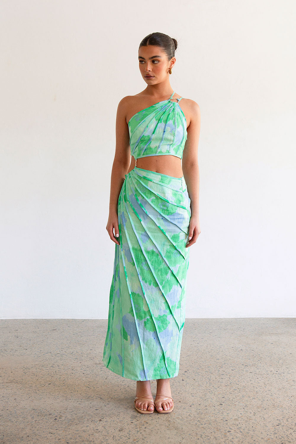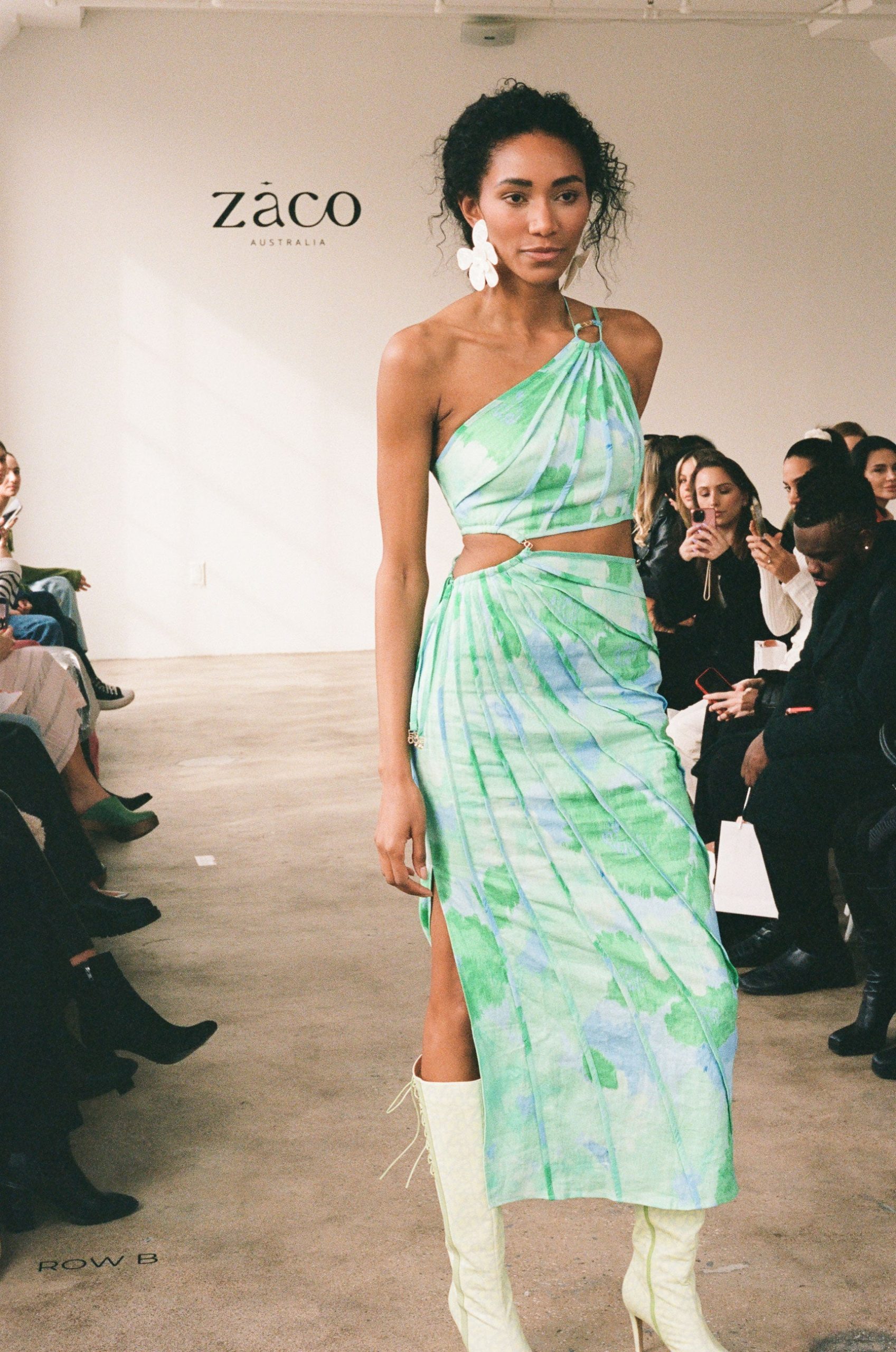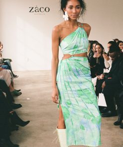 Signature dainty details to compliment this bold statement piece! The Jaliyah Dress is made from a high quality structured natural linen fabric with our exclusive blue gerbera print. It features an asymmetric neckline with adjustable double straps with gold ZÃCO hardware detail at neck, cutout at waist with a functional drawstring and gold ZÃCO hardware details, bind panels throughout and a full length skirt. Dress it up with the Strappy Jayda Heels for your next event. Exclusive ZÃCO design.