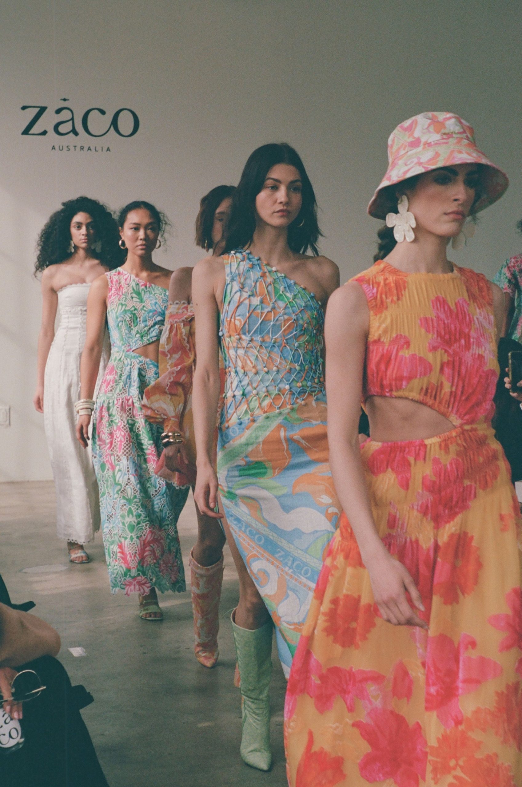Timeless femininity, dramatic details and a bold print! The Mariella Midi Dress is crafted from a luxurious velvet-feel nylon viscose blend burnout fabric with our exclusive floreale sunny print. It features a high neckline, shirring and gathered panels across bodice and hips, cutout at waist and a dreamy flouncy midi skirt. Add heels for a stand-out look at your next event! Exclusive ZÃCO design.