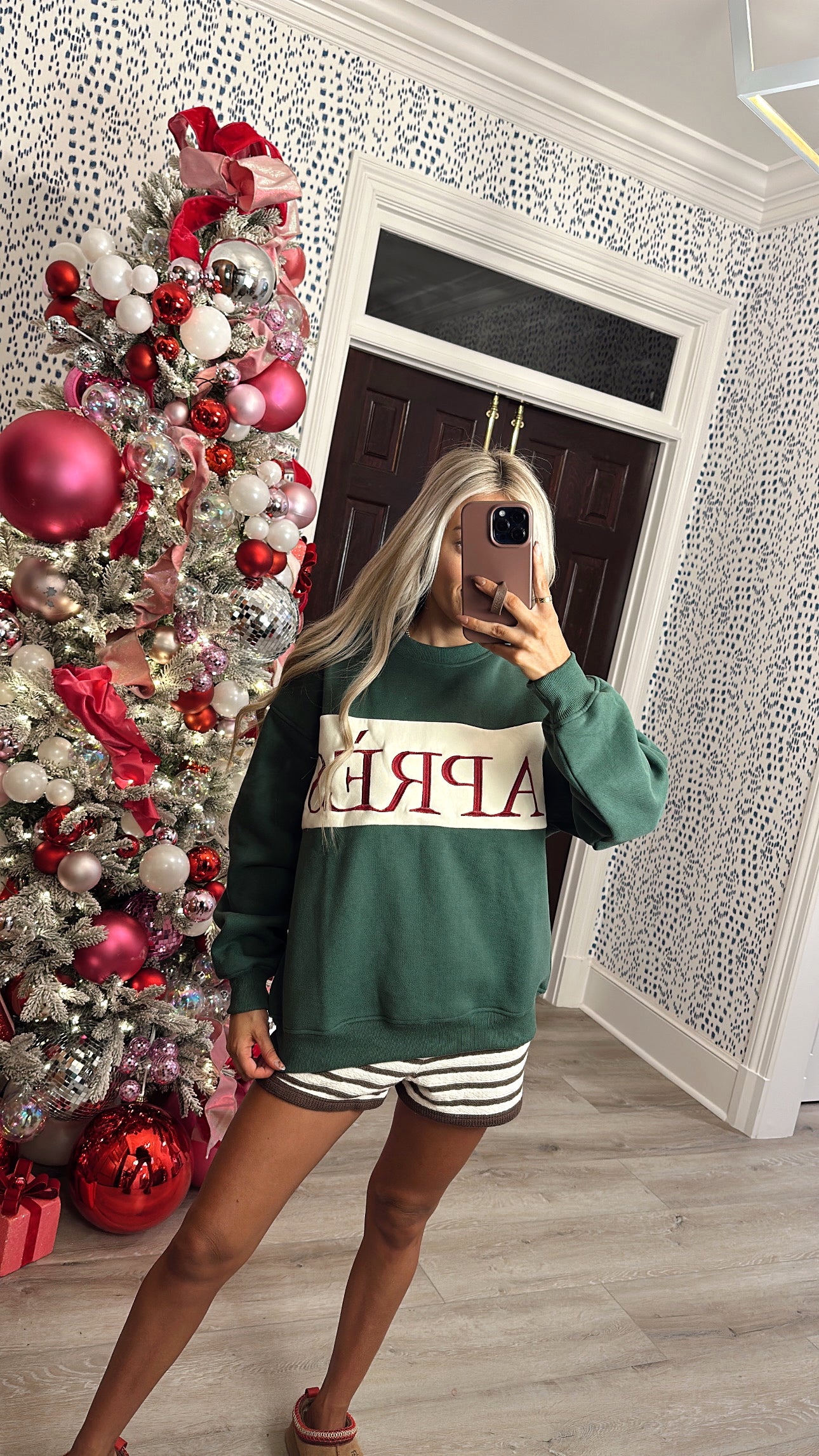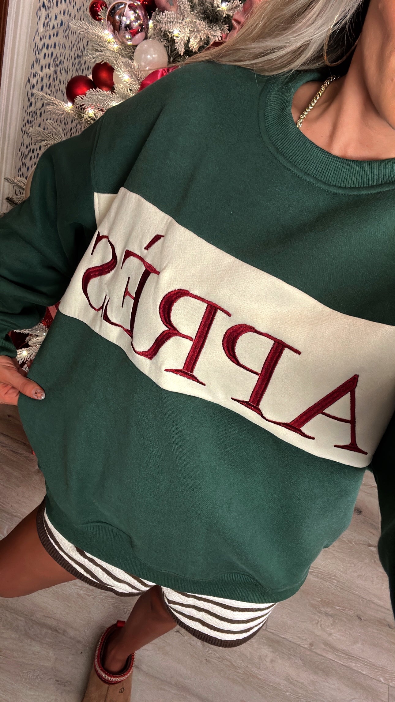 Our Aprés Ski crewneck is fully embroidered. The red and green color combo makes for a rich, classy design! This sweater is top notch quality!