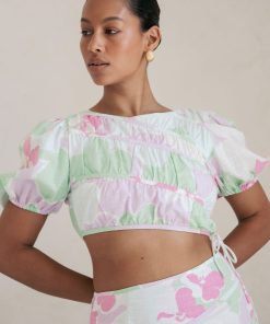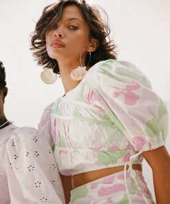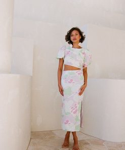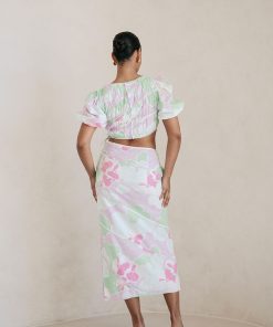 Turn heads at your next event in the super cute SABO LUXE Elika set! The Elika Top is made from a high quality natural cotton slub fabric with our exclusive misty floral print. It features bold puff sleeves, asymmetric bind panel with gathering details, asymmetric cropped hem and tie at side. Pair with the Elika Midi Skirt and tie together at side and style with the Dia Heels! Designed exclusively by Sabo.