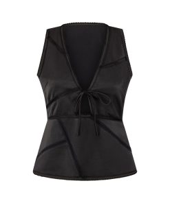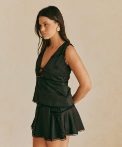 The 90’s inspired Sable Top is made from a chic silky fabric in black. It features a plunging neckline with tie closure, sheer mesh and circle trim panel details throughout and an a-line hem. Get the look with the Sable Skirt! Designed exclusively by Sabo.
