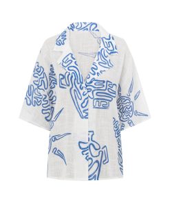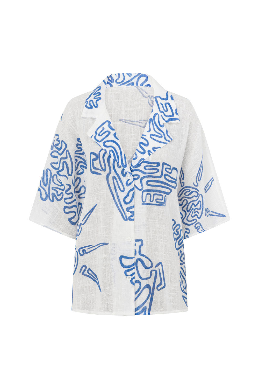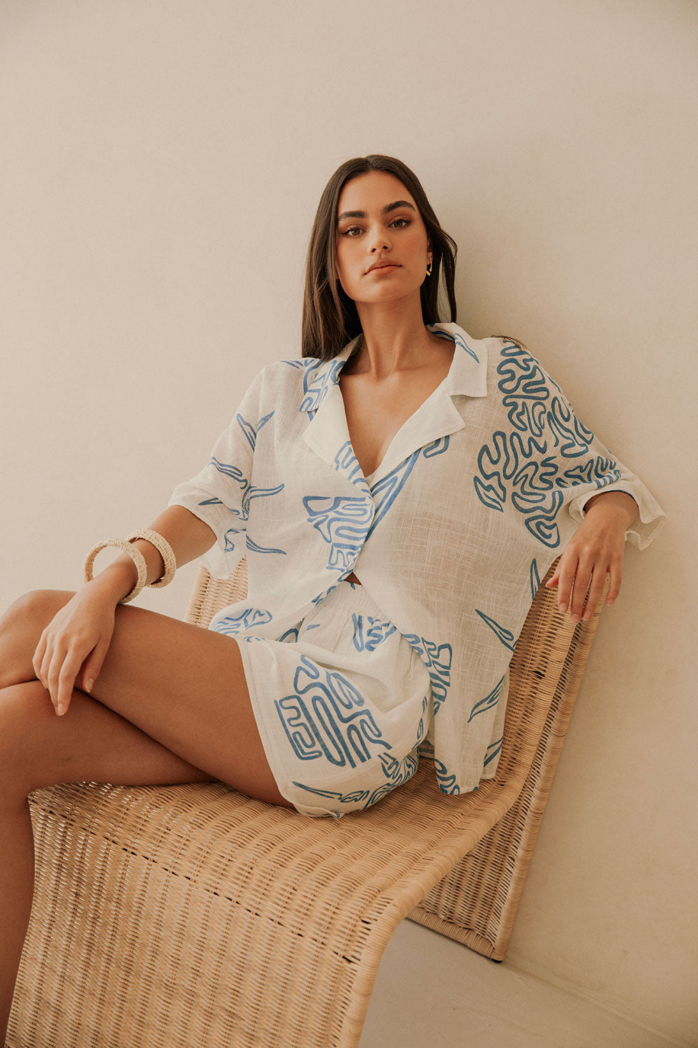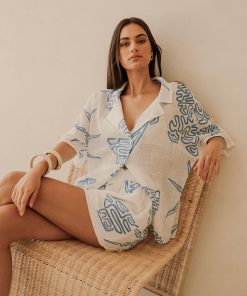 The perfect vacay outfit has arrived! The Seona Top is made from a natural cheesecloth cotton fabric in our exclusive Evoke Blue print. It is a relaxed style featuring boxy short sleeves, buttons down centre front and a low lapel collar. Get the set with the Seona Shorts and Kia Sandals! Designed exclusively by Sabo.